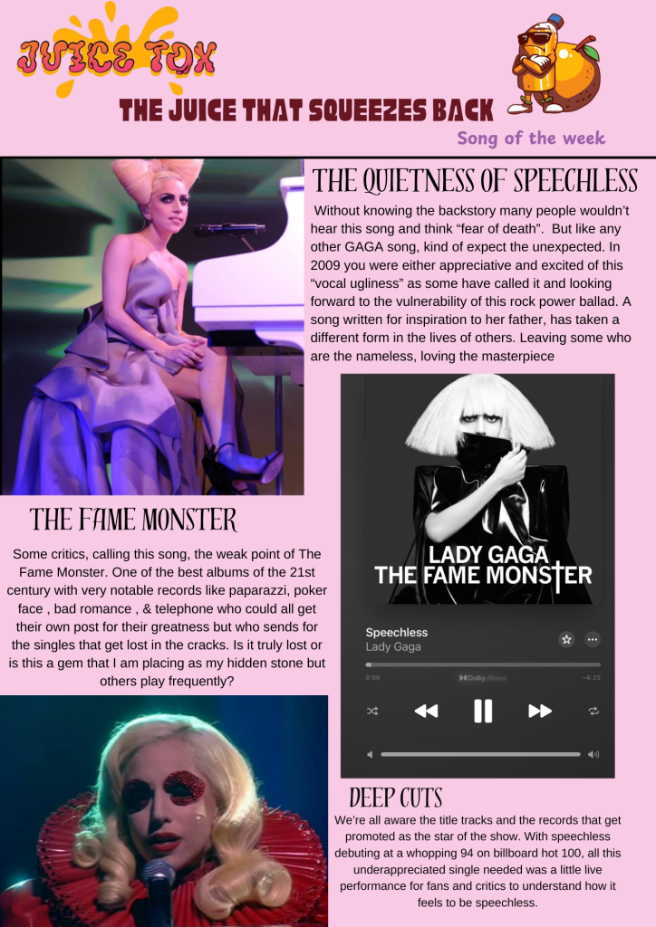 The first time I heard speechless very cliché for me to say, but I was in fact, speechless. It is rare to look back and see gaga in her poker face era, sing, and perform something so vulnerable and raw. A raw vocal experience, a raw listening experience. In hindsight and it being 2024, I am not surprised because of brilliant performances from gaga such as A Star is Born, where she shows her range in not only vocal performance, but as an actress. But when the song came out, I was only nine years old, but who says nine-year-olds don’t know music?